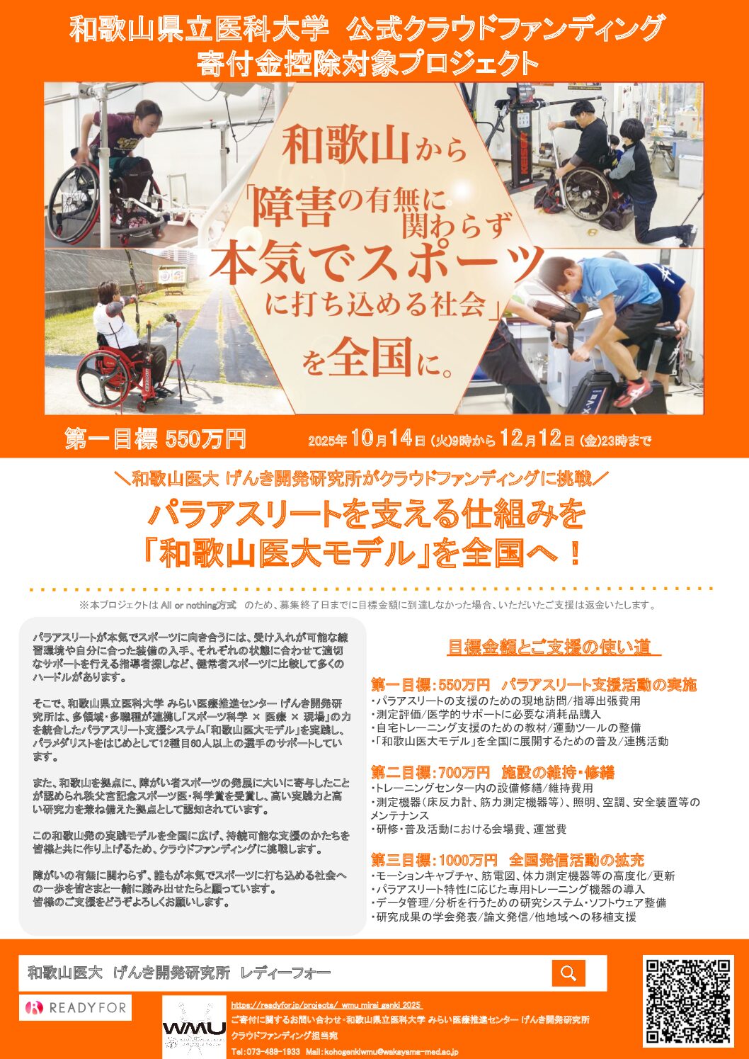 和歌山県立医科大学 公式クラウドファンディング 寄付金控除対象プロジェクトの案内です。 パラアスリートを支える仕組み「和歌山医大モデル」を全国へ! https://readyfor.jp/projects/wmu_m…詳細を見る -